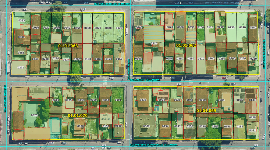Os elementos como quadras, lotes, eixos de logradouros, faces de quadra e edificações são geocodificados com base nos cadastros alfanuméricos oficiais do município.